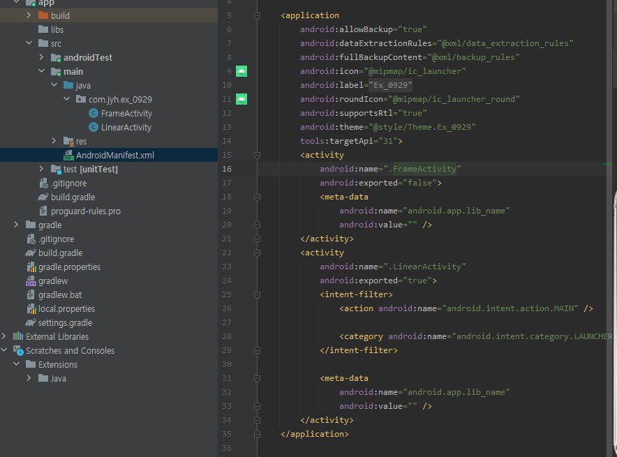 AndroidMainfest.xml 들어가면 내가 만든 Activity 2개를 확인할 수 있다.