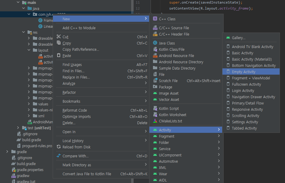 AndroidMainfest.xml 들어가면 내가 만든 Activity 2개를 확인할 수 있다.