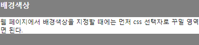 <p>웹 페이지에서 배경색상을 지정할 때에는 먼저 css 선택자로 꾸밀 영역을 선택하고 background-color 속성 키에 값을 지정하면 된다.</p>