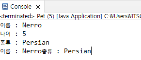System.out.println("이름 : " + name + "종류 : " + variety);