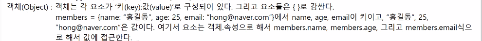 - 객체(Object) : 객체는 각 요소가 '키(Key):값(Value)' 로 구성되어 있다. 그리고 요소들은 { } 로 감싼다.