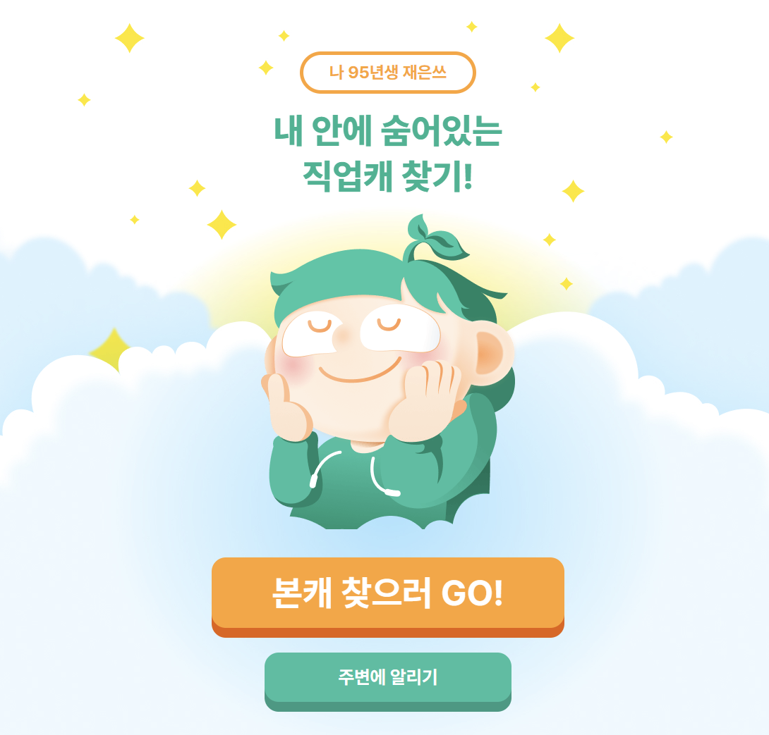 메인 페이지 구조 만들기 index.html 나 95년생 재은쓰 내 안에 숨어있는 직업캐 찾기! 본캐 찾으러 GO! 주변에 알리기 home.css body{ background-color: #f6fcff; background-image: url("../images/main_bg.jpg"); background-position: top center; background-repeat: no-repeat; } .character { width: 100%; max-width: 364px; margin-left: auto; margin-right: auto; margin-bottom: 40px; } common.css - 여러 번 사용하는 코드들을 따로 만들기 - css 를 활용하여 애니메이션 효과주기 body ..